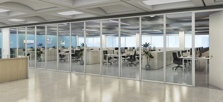 Outra opção bastante interessante e moderna é o investimento em divisórias de vidro, madeira ou mistas. As divisórias de vidro transparente separam espaços mantendo a amplitude do ambiente e o contato visual entre as equipes. Podem ser fornecidas com persianas que são fechadas sempre que necessário. É uma solução elegante que ajuda a minimizar ruídos, dividir equipes, salas de reuniões e ainda contribuem com a decoração do escritório.